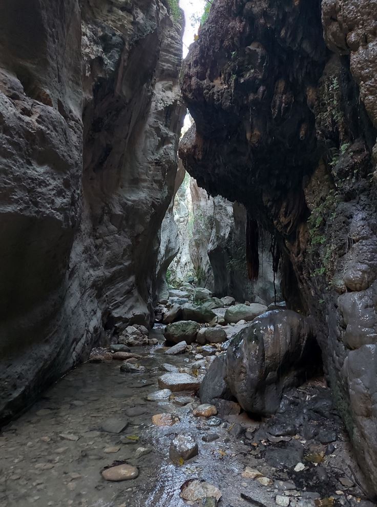 Dodatkowego ochłodzenia możesz zaznać, jeśli natrafisz na okres wypełnienia wąwozu wodą (o tym wspominam w dalszej części tekstu). Trasa jest wtedy poprzecinana dość wartko płynącym potokiem. Polecam zatem zabrać sportowe obuwie i uważnie stąpać po śliskich kamieniach. Niektóre fragment wąwozu pokonywałem niczym uczestnicy programu Ninja Warrior tor przeszkód.